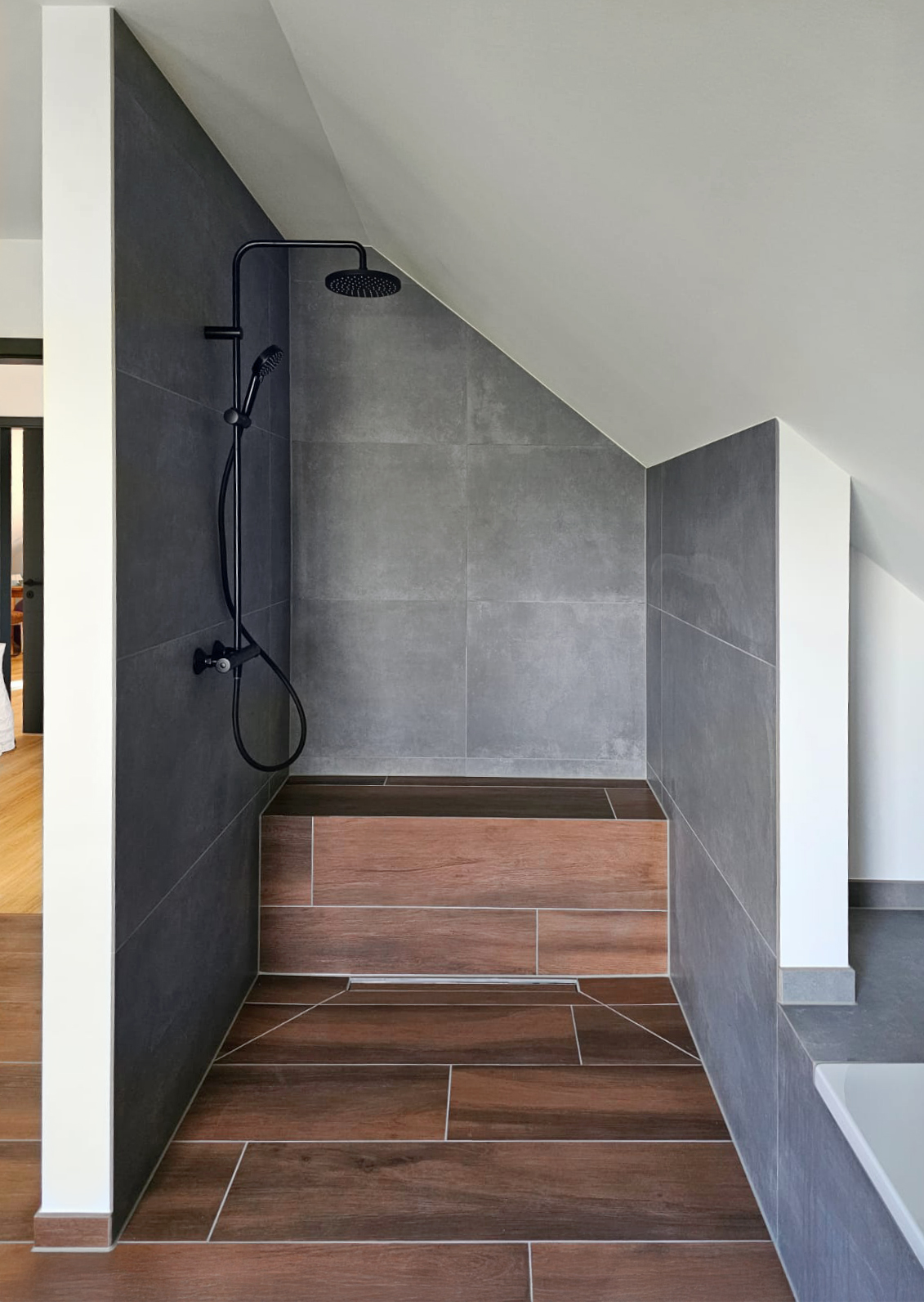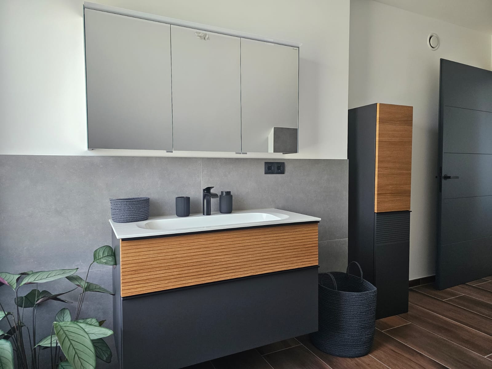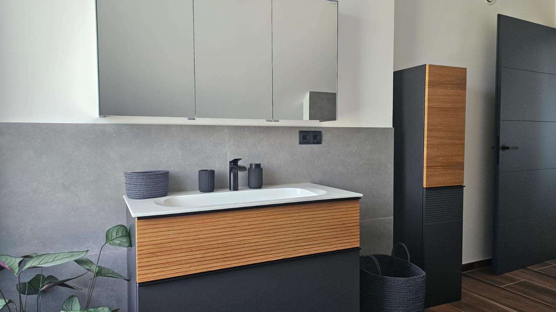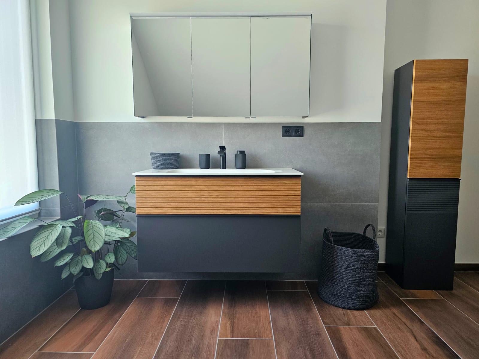 Die Kombination aus dunklen Grau- und Schwarztönen mit warmen Holzakzenten verleiht dem Raum eine moderne, zugleich aber wohnliche Atmosphäre. Die klaren Linien, minimalistische Formgebung und durchdachte Funktionalität machen dieses Badezimmer zu einem echten Wohlfühlort. Ein besonderes Highlight stellt die elektrische Fußbodenheizung dar, die nicht nur im Bodenbereich, sondern auch in der Dusche, über den Duschsitz sowie an der Wand zum Anlehnen fortgeführt wurde und so für zusätzlichen Komfort und ein angenehmes Raumklima sorgt.