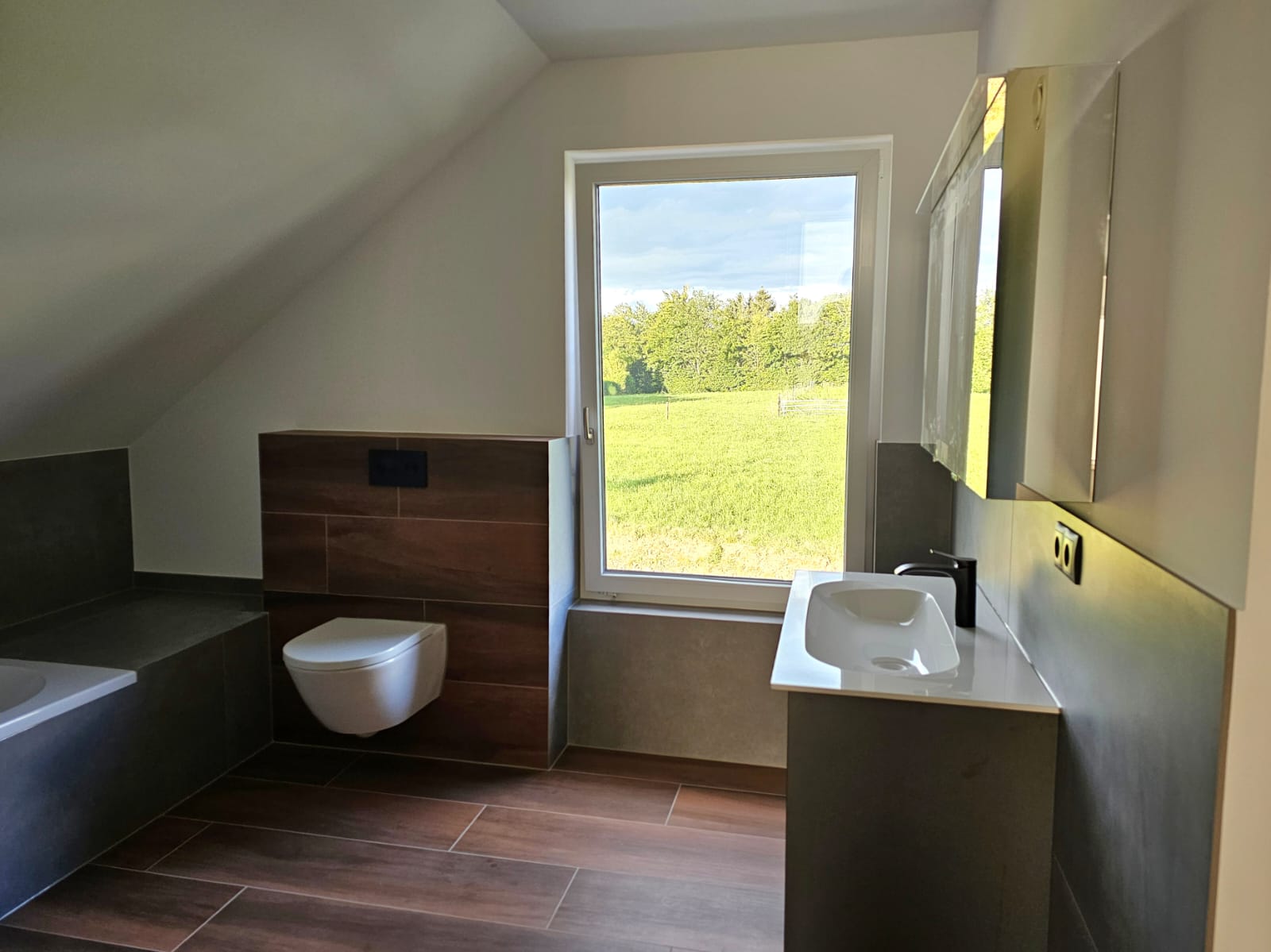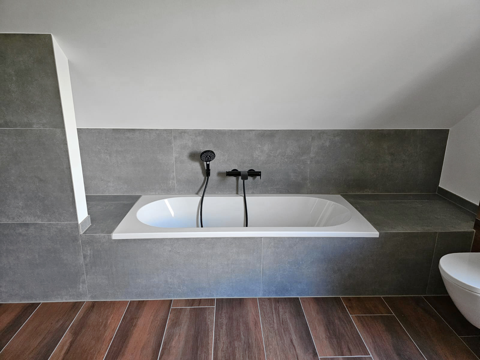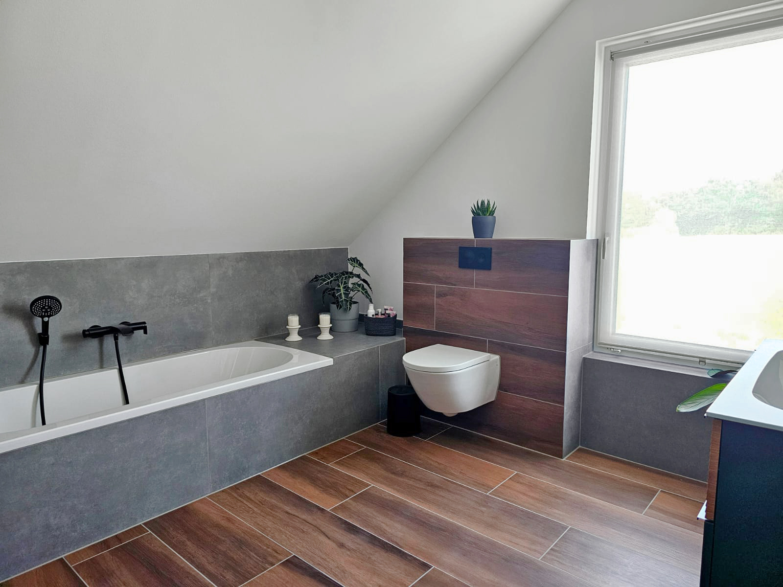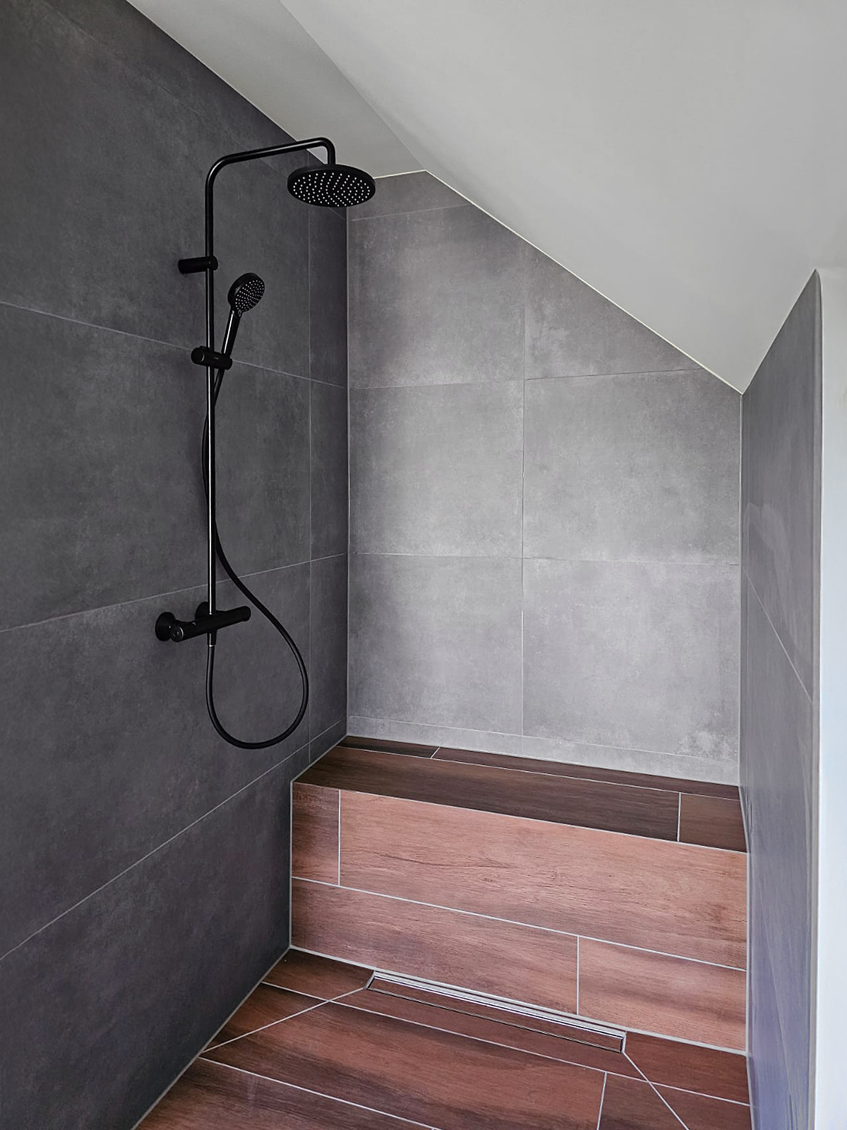 Die Kombination aus dunklen Grau- und Schwarztönen mit warmen Holzakzenten verleiht dem Raum eine moderne, zugleich aber wohnliche Atmosphäre. Die klaren Linien, minimalistische Formgebung und durchdachte Funktionalität machen dieses Badezimmer zu einem echten Wohlfühlort. Ein besonderes Highlight stellt die elektrische Fußbodenheizung dar, die nicht nur im Bodenbereich, sondern auch in der Dusche, über den Duschsitz sowie an der Wand zum Anlehnen fortgeführt wurde und so für zusätzlichen Komfort und ein angenehmes Raumklima sorgt.