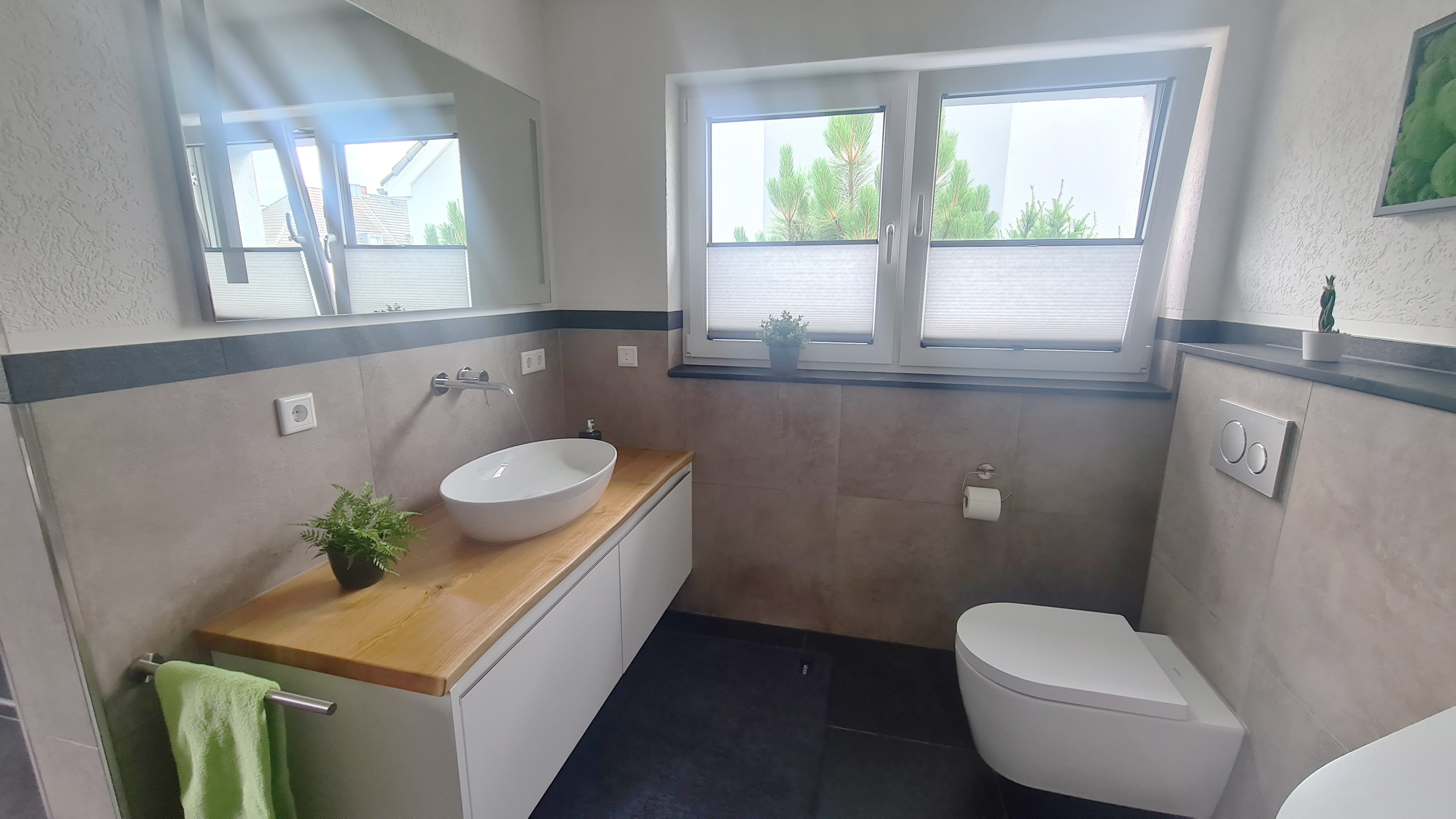 Ein besonderes Highlight ist der maßgefertigte Waschtisch mit Echtholzplatte und elegantem Aufsatzbecken, das durch seine filigrane Wandarmatur ergänzt wird. Die bodenebene Walk-in-Dusche mit rahmenloser Glasabtrennung sorgt für Barrierefreiheit und optische Großzügigkeit.