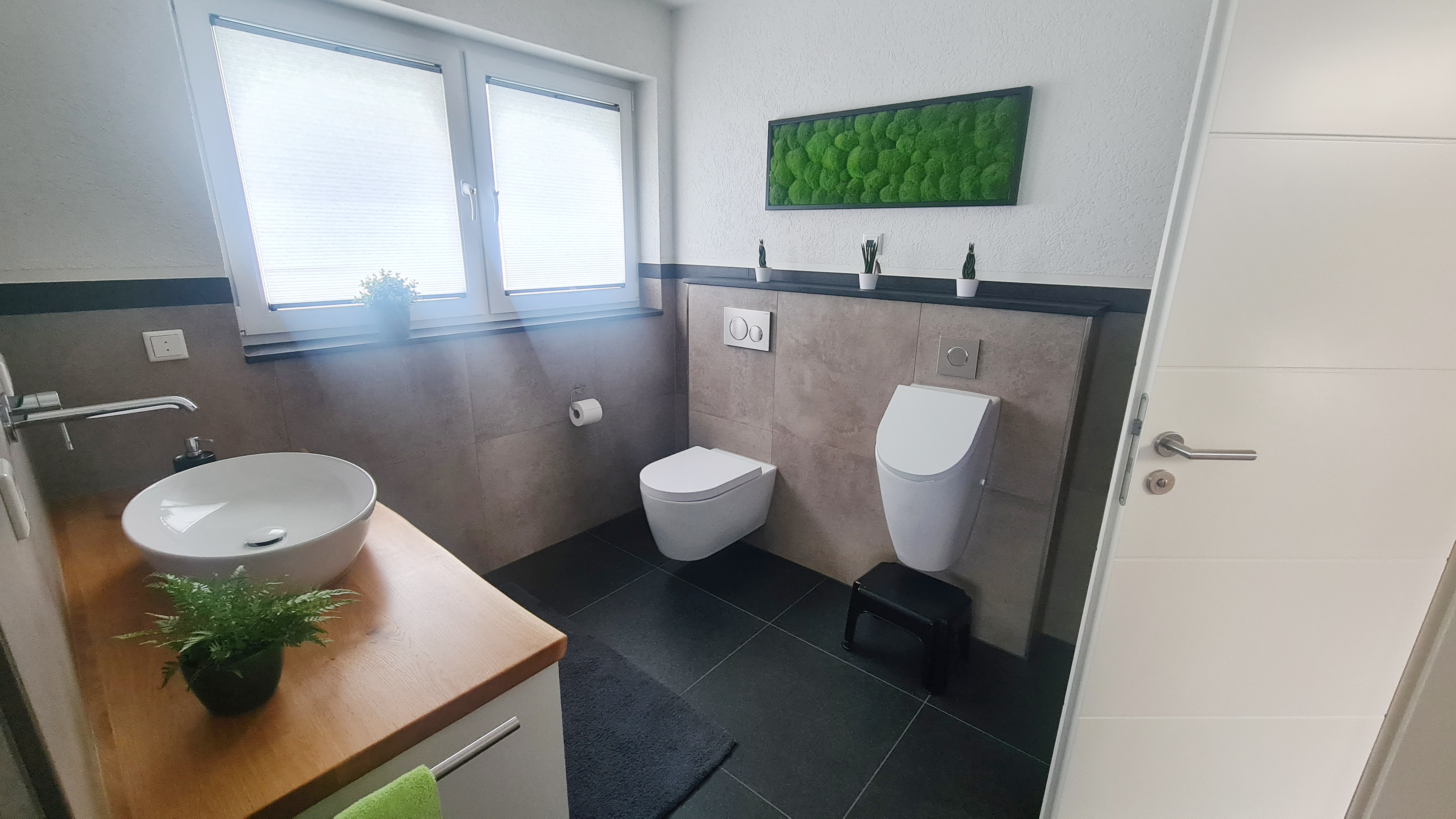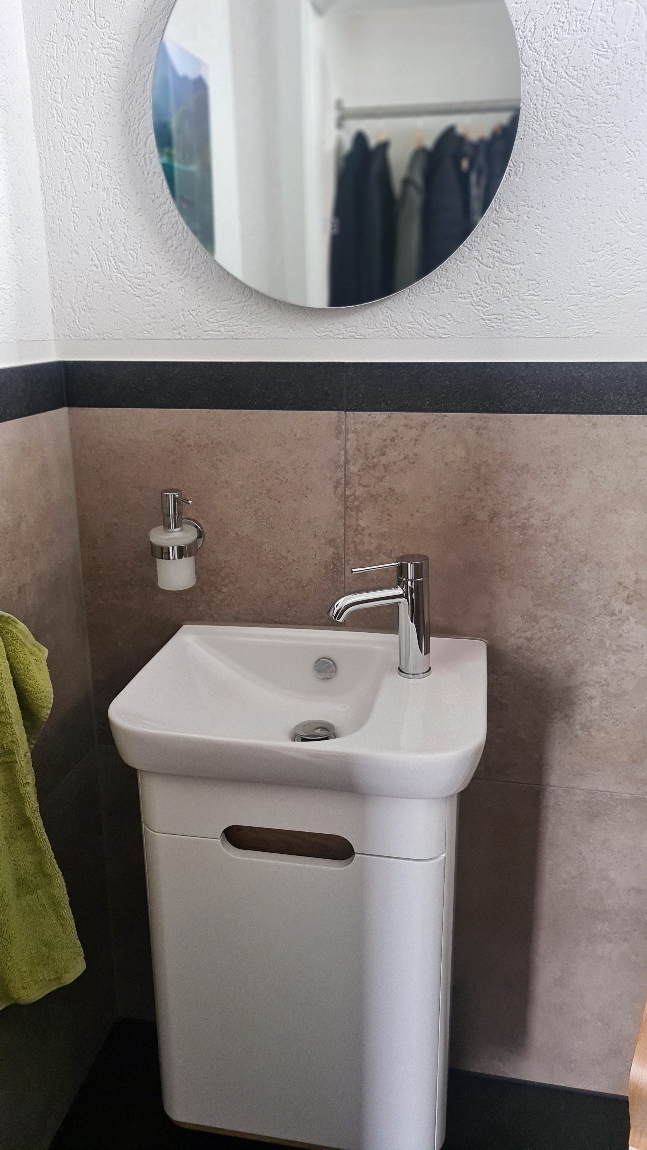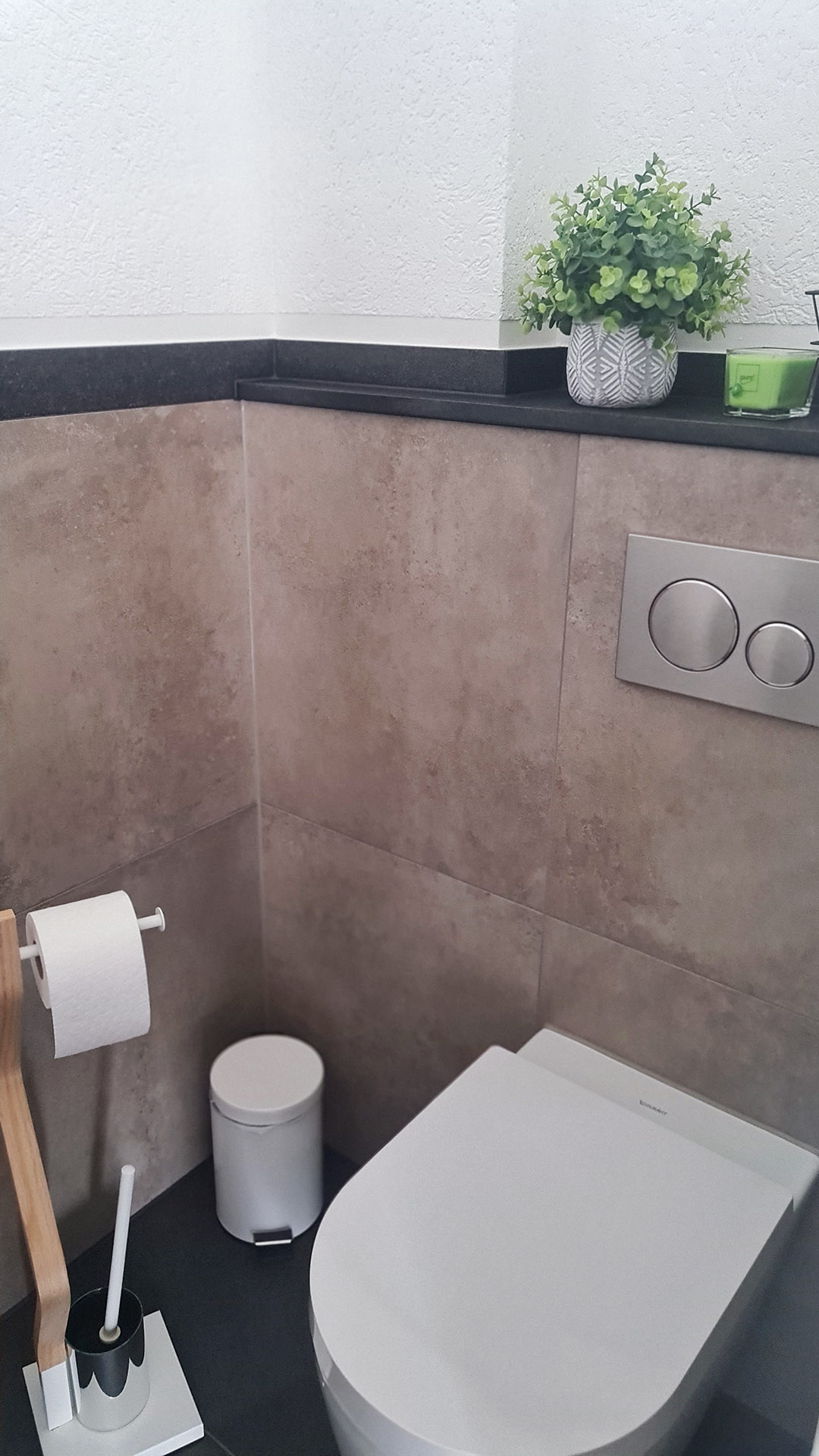Diese Gästetoilette beweist, dass auch kleine Räume großes Designpotenzial bieten. Hochwertige Materialien, eine klare Linienführung und gezielt eingesetzte Akzente schaffen eine einladende Atmosphäre für Besucher und Bewohner gleichermaßen.