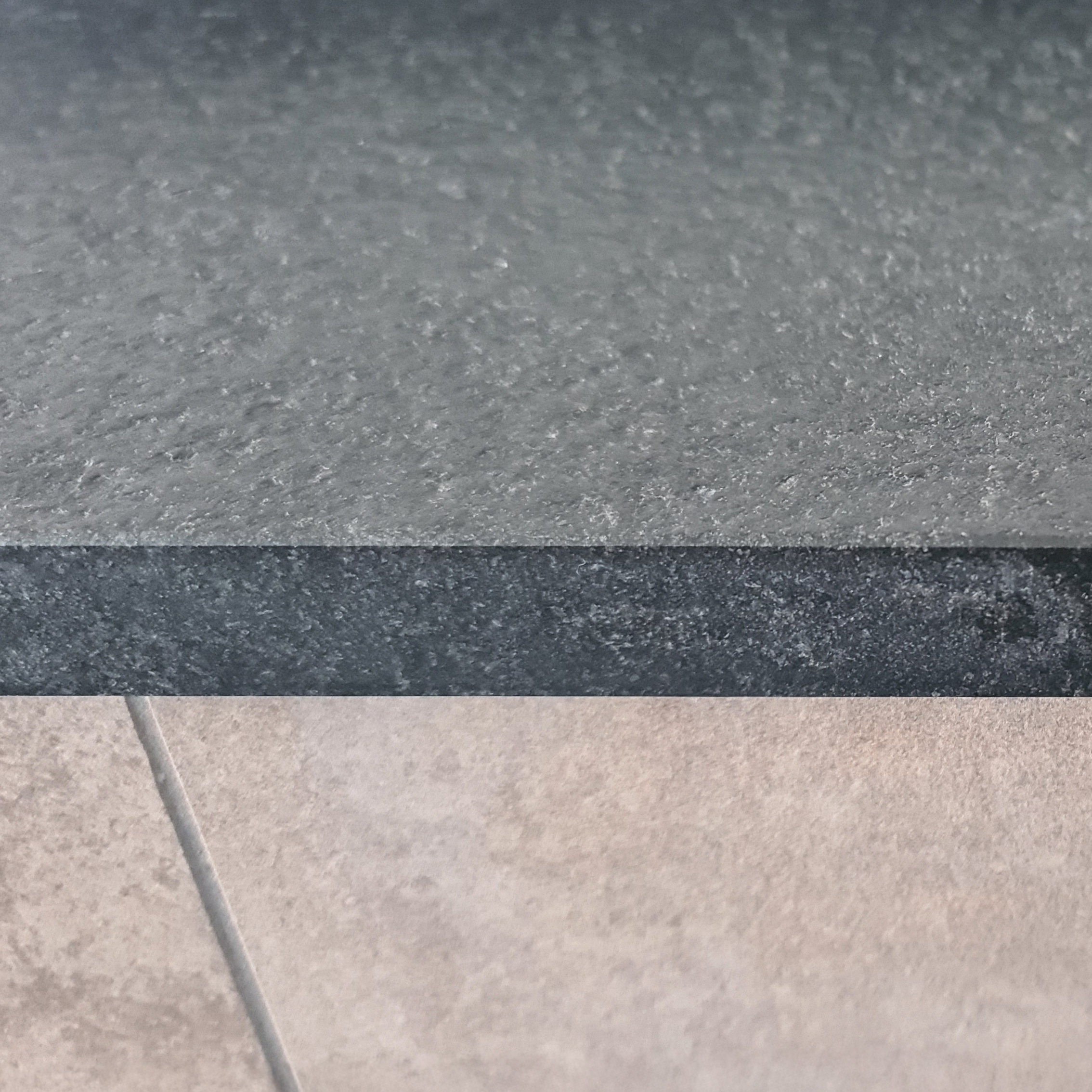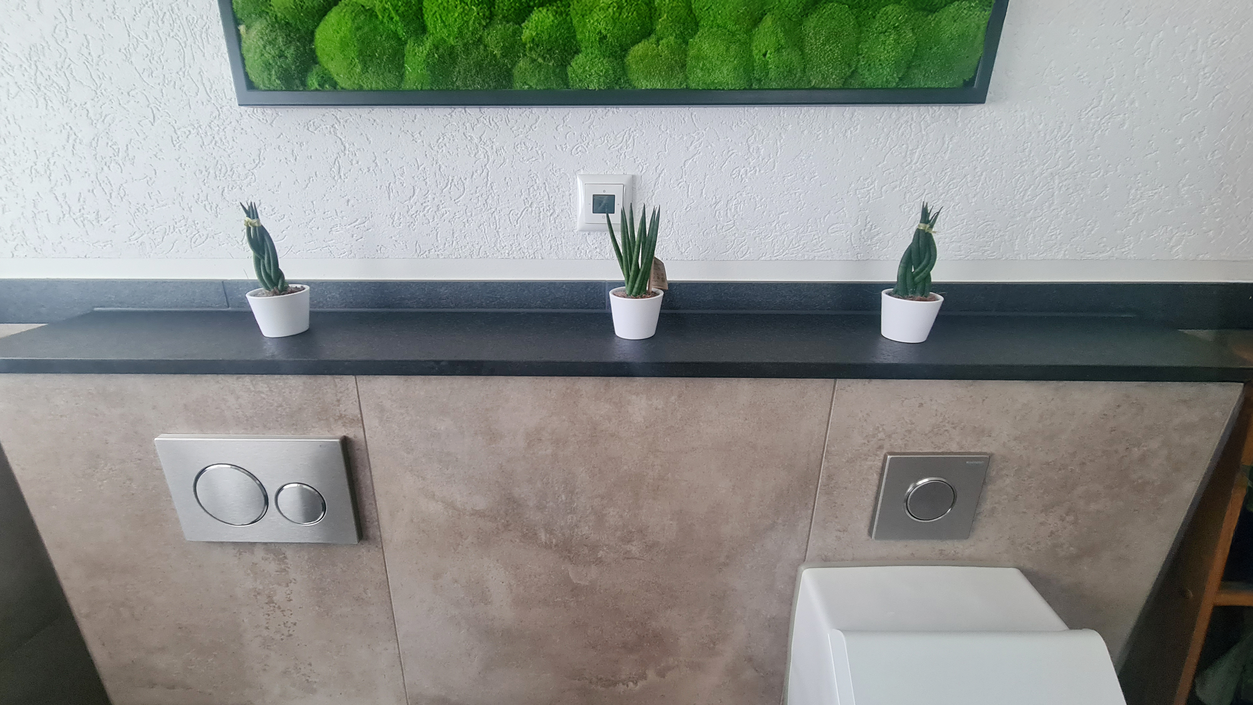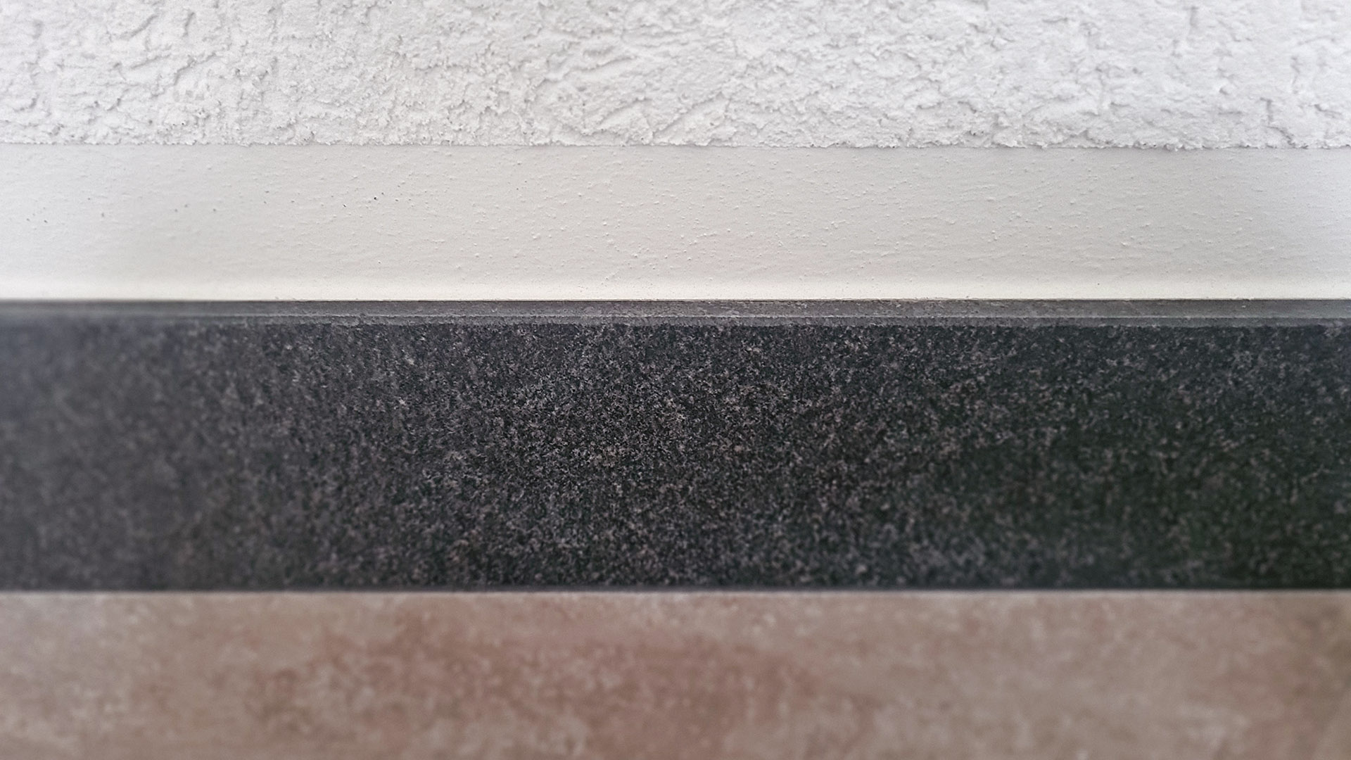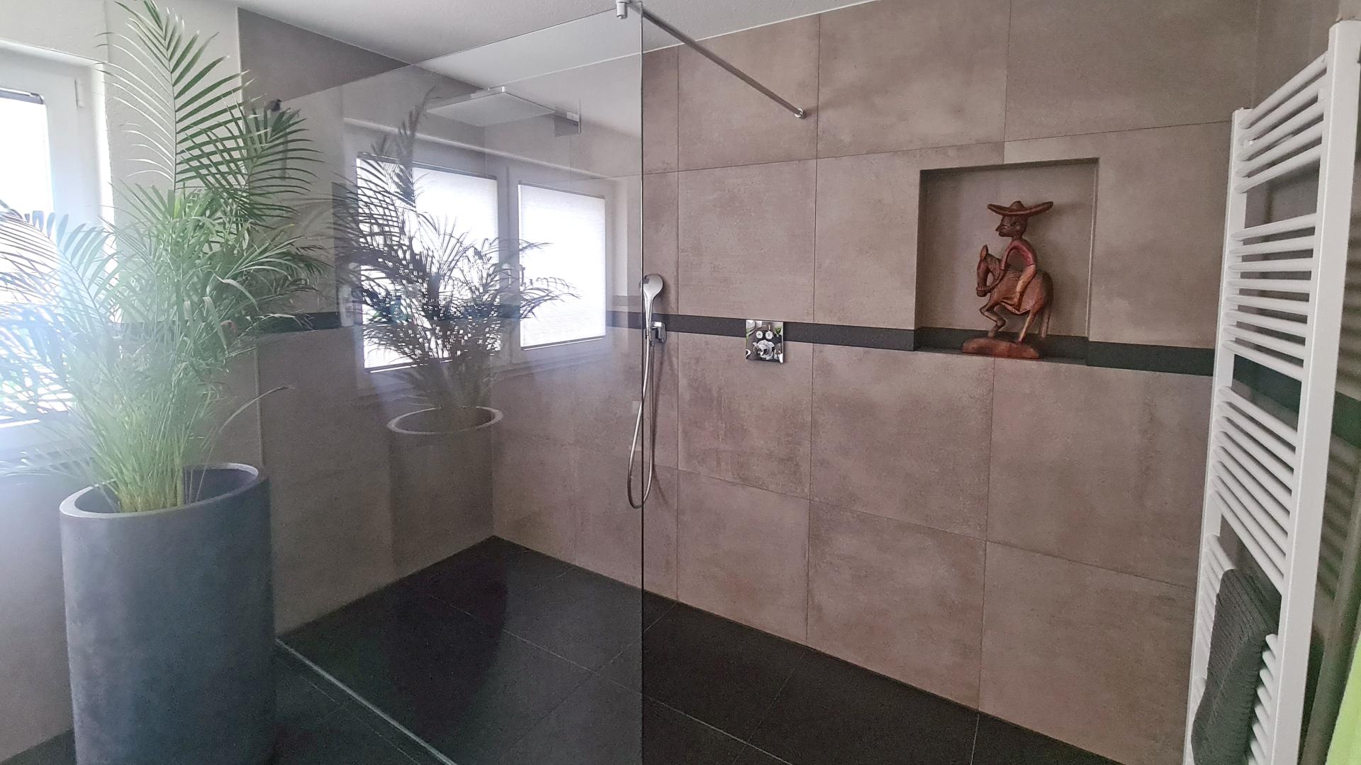 Bei diesem Badezimmerprojekt stand eine klare Formsprache im Mittelpunkt. Als Wandfliesen wurden großformatige Feinsteinzeugfliesen gewählt, harmonisch kombiniert mit einer dunklen Naturstein Bodenfliese, welche sich auch als Wandabschluss als Bordüre wiederfindet.