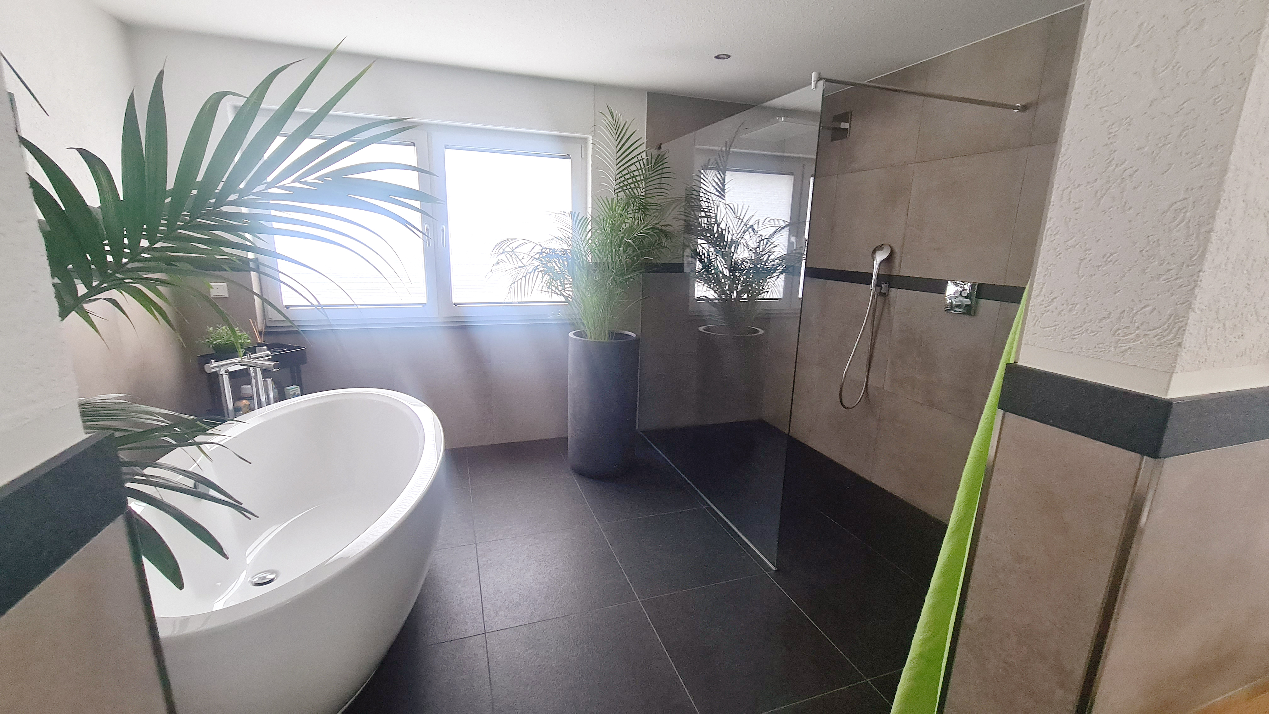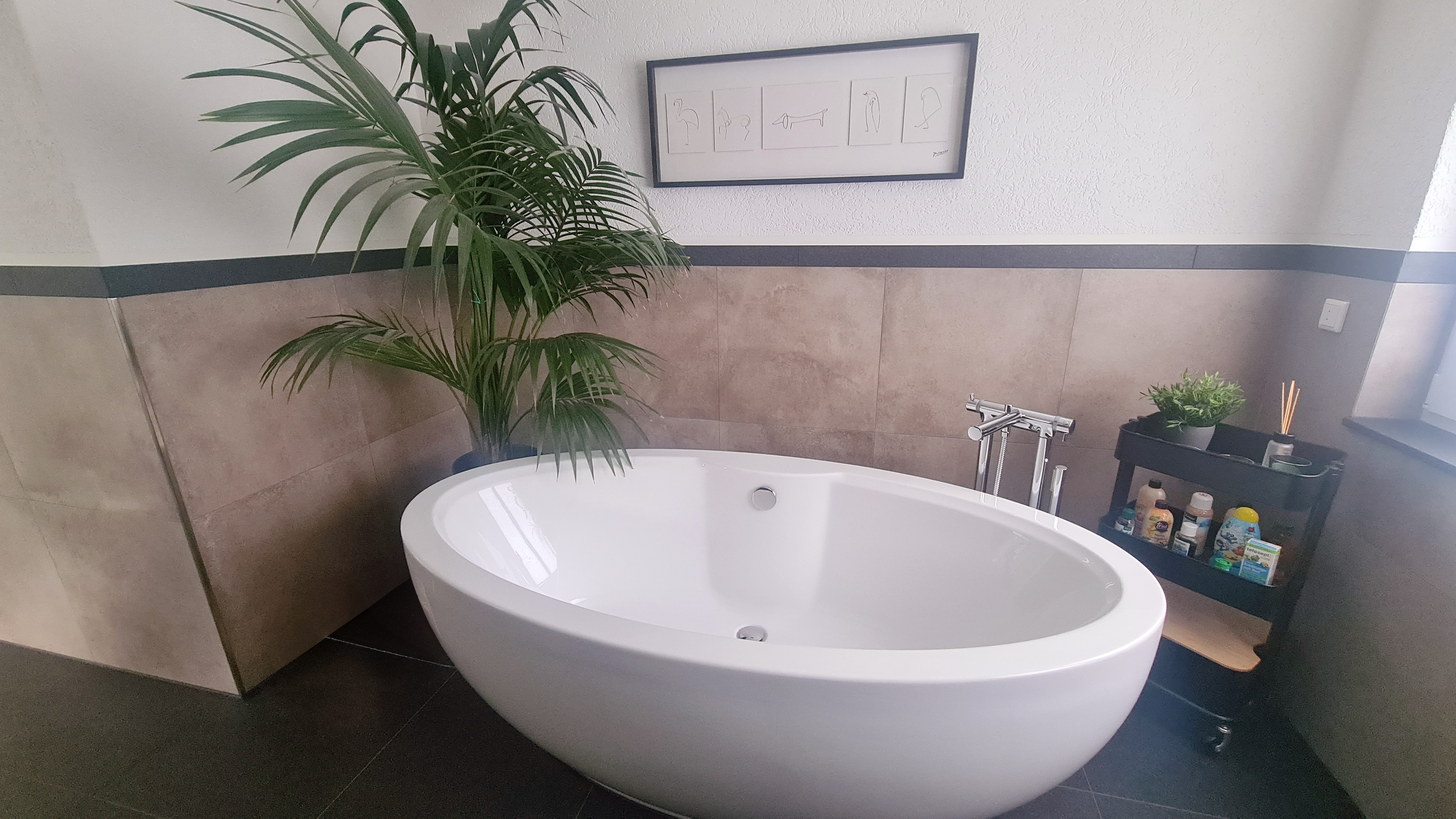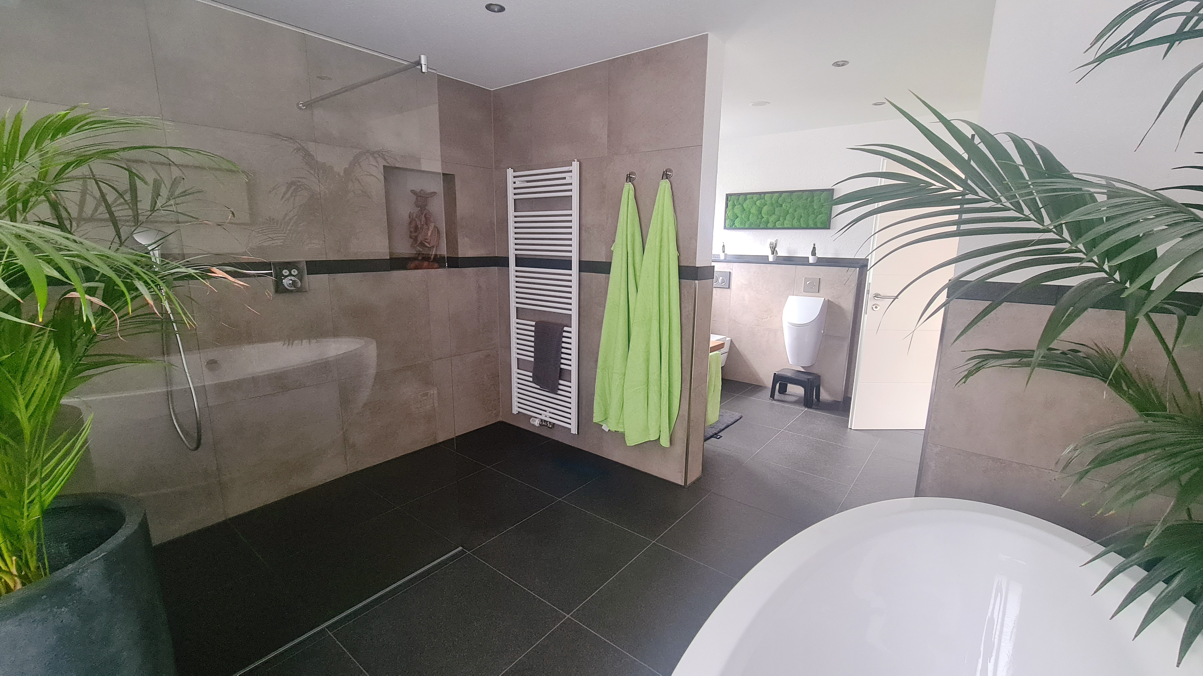 Die freistehende Badewanne schafft mit ihrer organischen Form und dem freistehenden Armatur-Element ein echtes Wellness-Gefühl. Grünpflanzen und gezielt platzierte Dekorationen bringen zusätzlich Lebendigkeit und Frische in den Raum.