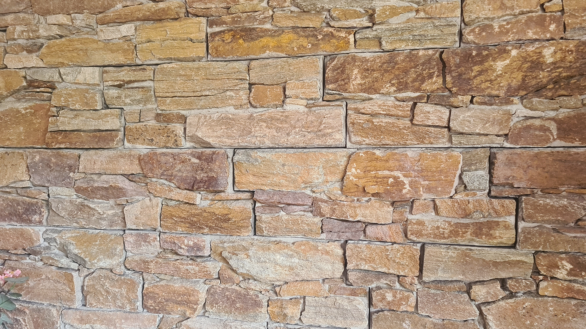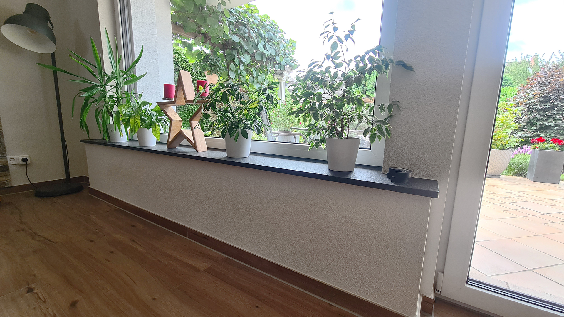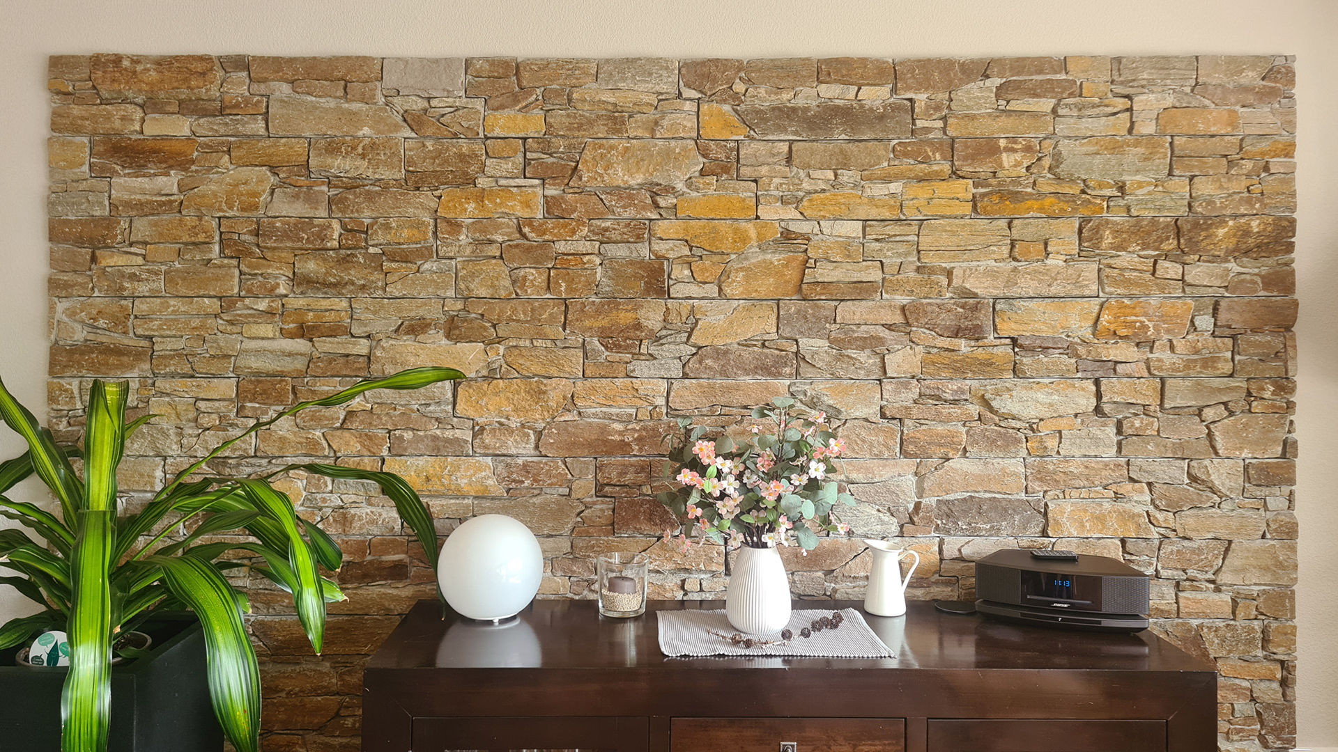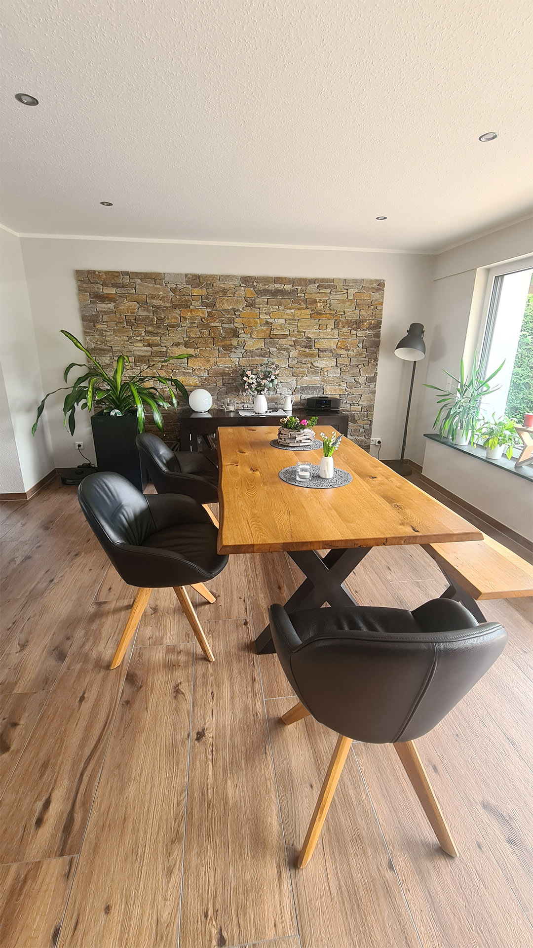 Eine Natursteinwand im Essbereich bringt zusätzlich Struktur und Natürlichkeit in den Raum. Das Ergebnis: Ein Wohnraum, der stilvolle Behaglichkeit mit zeitloser Funktionalität vereint.