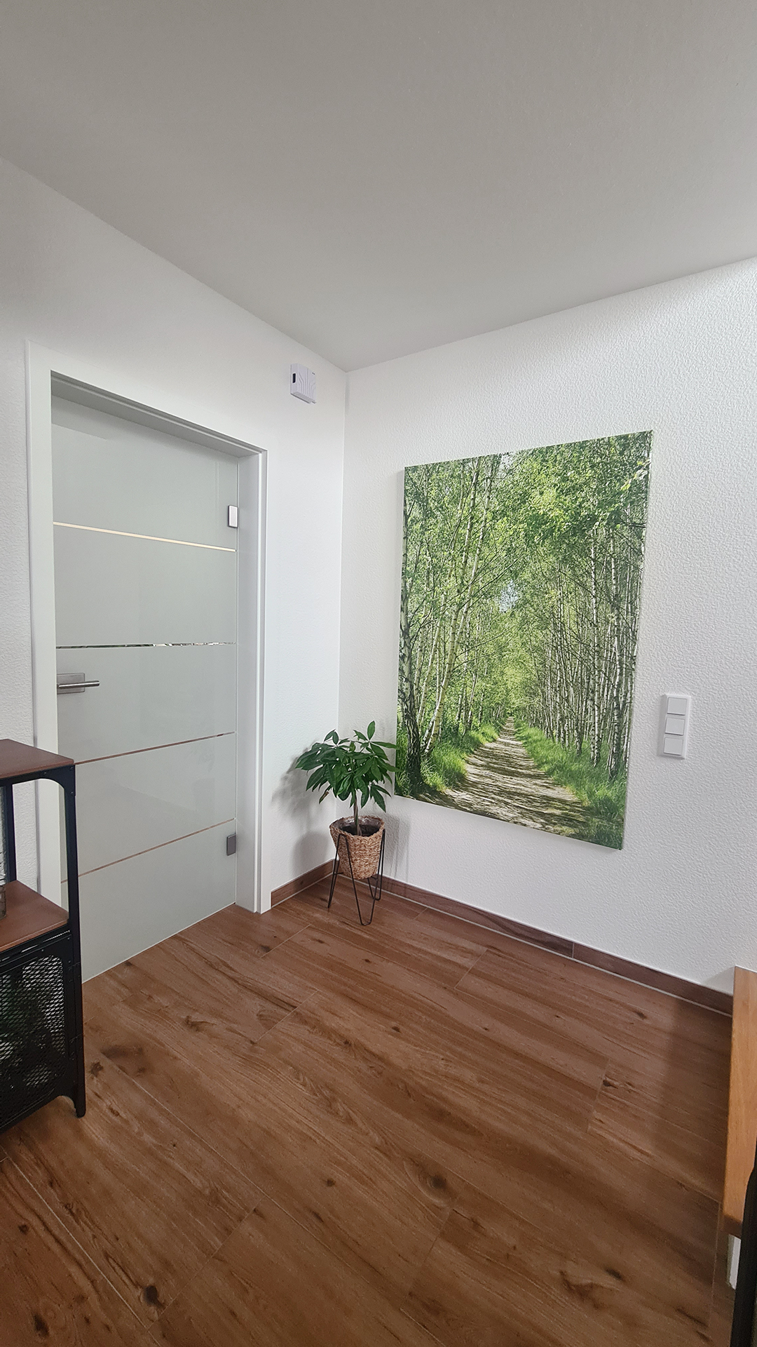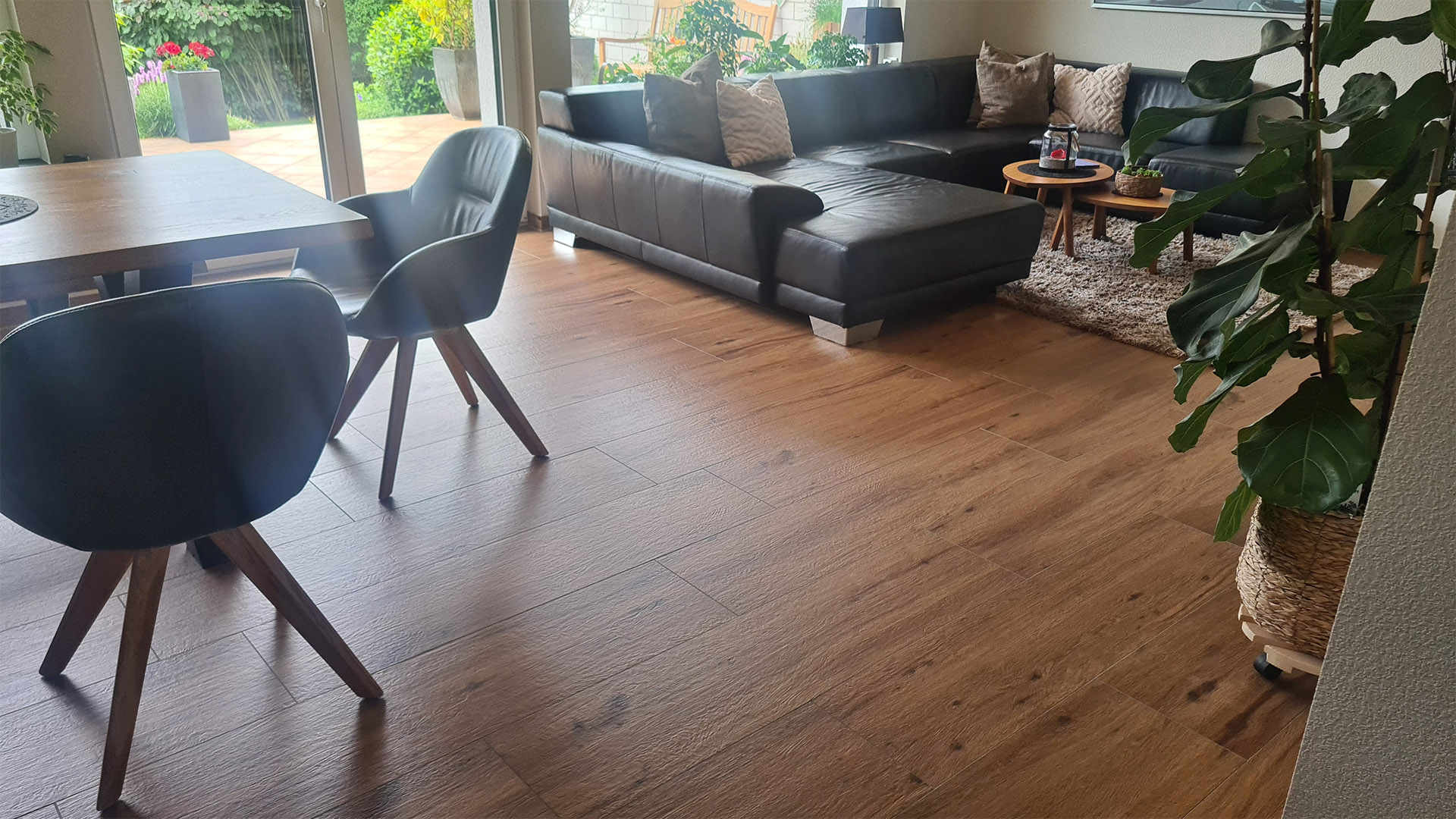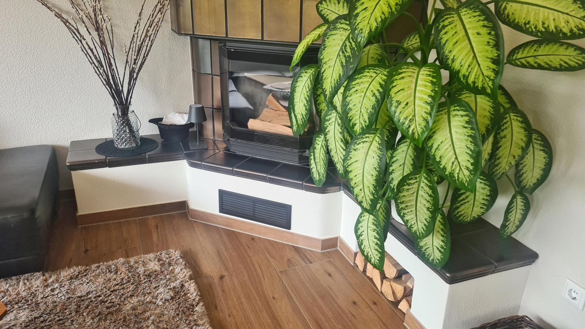 Dieses Wohnprojekt vereint hochwertige Materialien, klare Linien und wohnliche Wärme. Der durchgehend verlegte, naturgetreue Holzoptikboden sorgt für ein harmonisches Gesamtbild und schafft eine behagliche Atmosphäre in jedem Raum. Der stilvoll integrierte Kamin mit dunkler Fliesenverkleidung bildet das Herzstück des Wohnzimmers und wird von dezenten Dekoelementen ergänzt. Die massive Esstischgruppe mit Naturkante und modernem Gestell fügt sich harmonisch in das Gesamtbild ein.